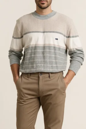 Stay cozy and stylish this winter with this elegant Men’s Striped Round-Neck Sweater. Crafted from a soft knitted wool-blend fabric, it provides excellent warmth and comfort during chilly days. The dual-tone grey and white stripe pattern gives a sophisticated look that pairs effortlessly with jeans, trousers, or chinos.
